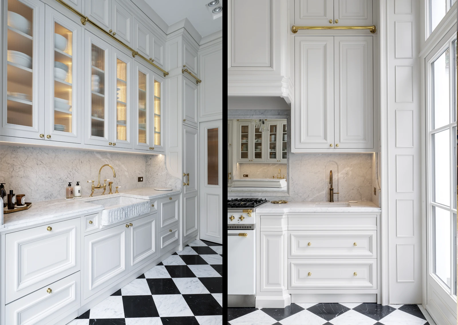 Armoires moulurées et façonnées avec soin, éviers en porcelaine : chaque élément respecte l’esthétique classique tout en intégrant le confort moderne.